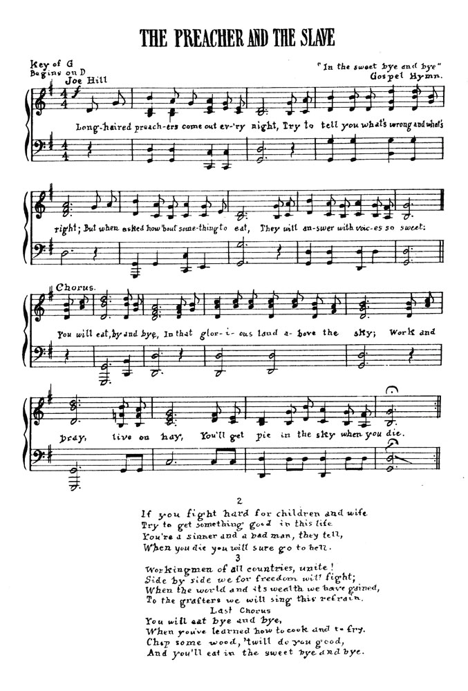 1Long-haired preachers come out every nightTry to tell you what’s wrong and what’s rightBut when asked how ’bout something to eatThey will answer in voices so sweetrefrain 1You will eat, bye and byeIn that glorious land above the skyWork and pray, live on hayYou’ll get pie in the sky when you die2And the Starvation Army, they playAnd they sing and they clap and they prayTill they get all your coin on the drumThen they tell you when you’re on the bum3Holy Rollers and Jumpers come outAnd they holler, they jump and they shoutGive your money to Jesus, they sayHe will cure all diseases today4If you fight hard for children and wifeTry to get something good in this lifeYou’re a sinner and bad man, they tellWhen you die you will sure go to hell.5Workingmen of all countries, uniteSide by side we for freedom will fightWhen the world and its wealth we have gainedTo the grafters we’ll sing this refrainrefrain 2You will eat, bye and byeWhen you’ve learned how to cook and how to fryChop some wood, ’twill do you goodThen you’ll eat in the sweet bye and bye